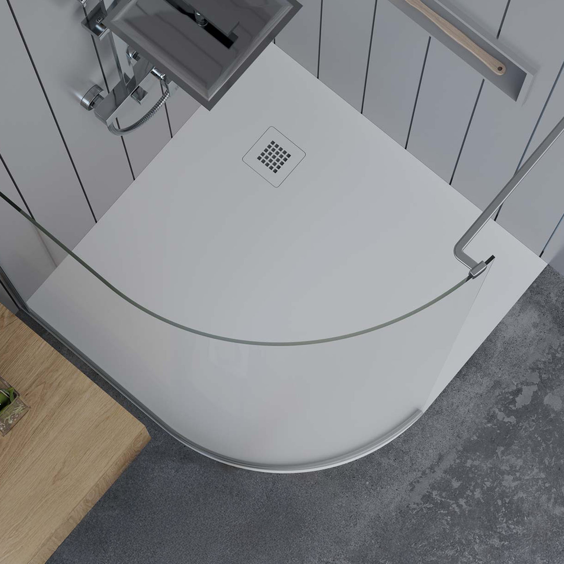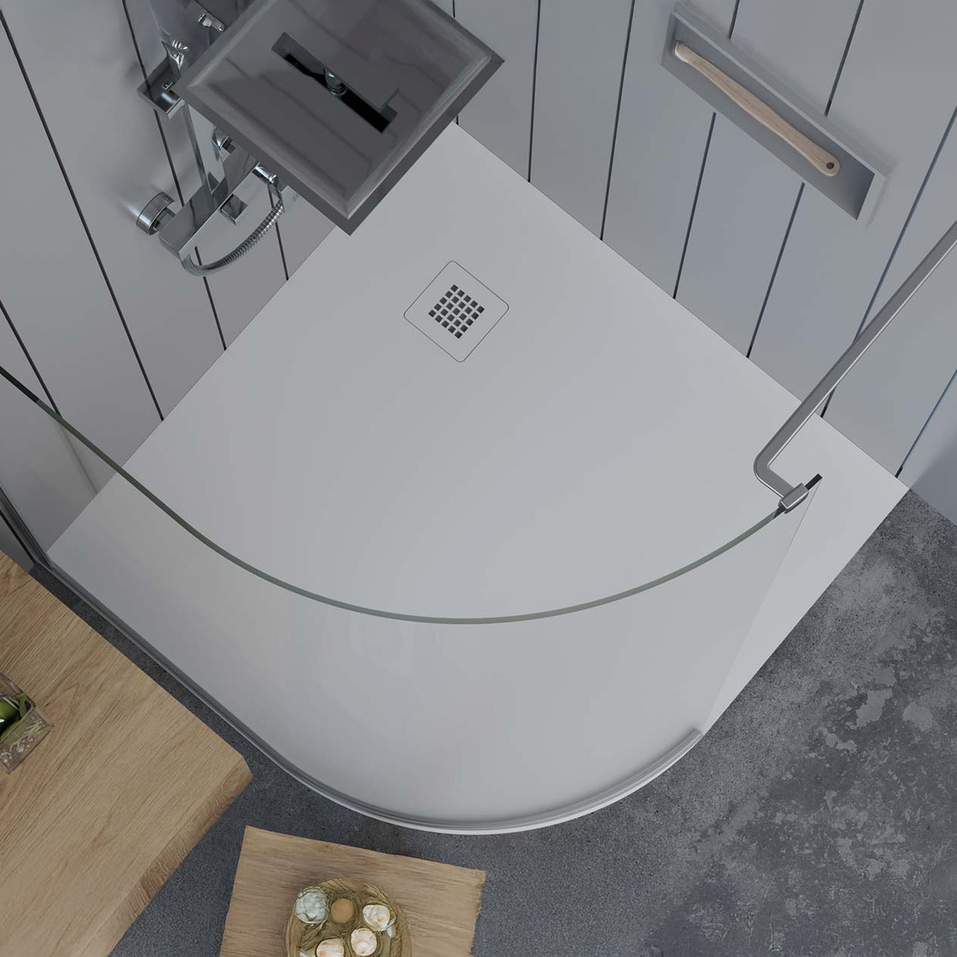 Mineralguss Duschwanne Stone Ceres Weiß – Halbkreisform – Mittiger Verdeckter Ablauf – Rutschfest und Langlebig